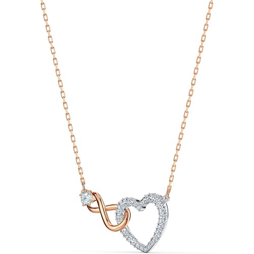 A white crystal heart is intertwined with a rose-gold tone plated infinity symbol in this lovely piece, which is a visible representation of the promise of everlasting love